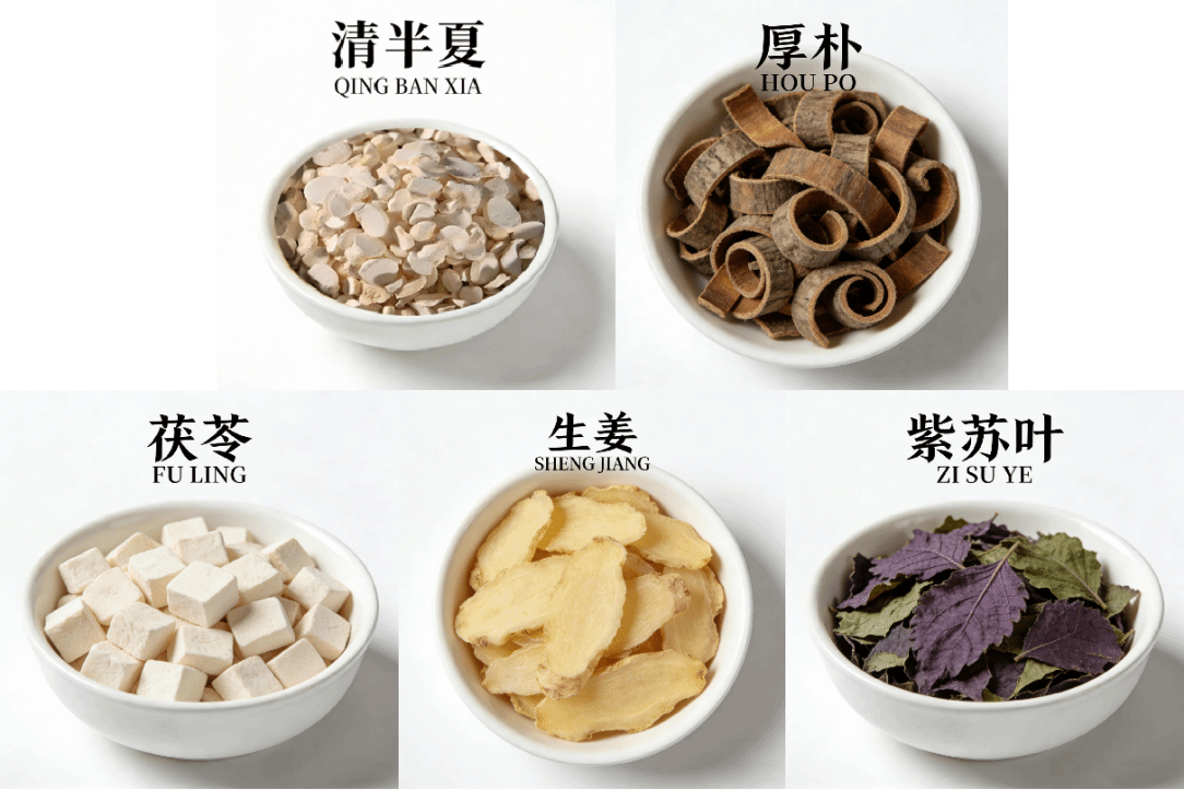 药材组成:清半夏15克,厚朴9克,茯苓12克,生姜15克,紫苏叶6克。