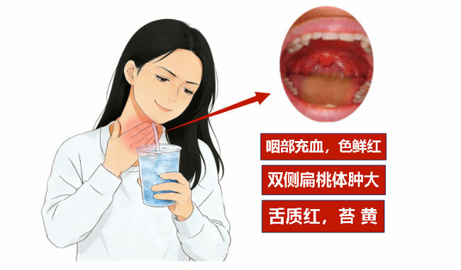 症状:此类咽痛的特点是,遇凉则痛减,受热则痛势加重。可伴发热(或无发热),咽部充血、色鲜红,双侧扁桃体肿大,甚者可见脓点。舌质红,苔黄,脉象滑数。