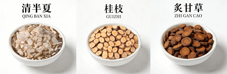 药材组成:清半夏、桂枝、炙甘草各10克